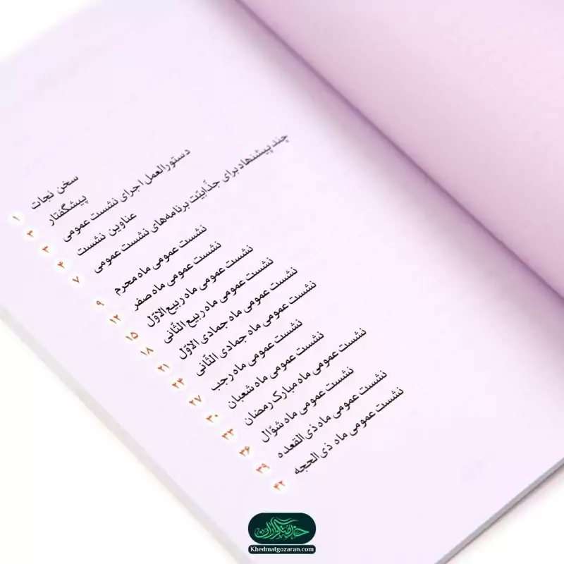 سپس نشست های عمومی ماه های قمری را به ترتیب از محرم تا ذی الحجه آورده است.